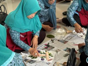 Pada pelatihan ecoprint, peserta mengikuti praktik langsung pembuatan ecoprint pada tas dan kain menggunakan teknik pounding dan steam. Bahan yang digunakan berupa berbagai jenis daun yang mudah ditemukan di lingkungan sekitar, sehingga mendorong pemanfaatan potensi alam secara sederhana, kreatif, dan ramah lingkungan.